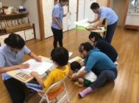 | 学校の長期休暇時は、通常時の生活のリズムを崩さないように普段の生活と大きく変わらない時間帯での支援を行います。通学時と変わらない団体生活の場を設定し日常生活力、集団・社会適応力を1日の生活の中で訓練や指導を通して学んでいきます。 通常時同様に個別支援計画書に基づく集中的な訓練・指導(1時間)、音楽療法、体育・運動、指導員による英語教育(楽しく学ぶ英語の時間)等を行います。その後に余暇支援として学習指導(苦手な教科や宿題等の指導))・レクレーション・創作活動・自由遊び等にて楽しく過ごし、帰りの会、お迎え、というようなサービス体系で長期休暇中の支援を行います。(送迎はありません) *必要に応じて食事指導を行う場合もあります。 |